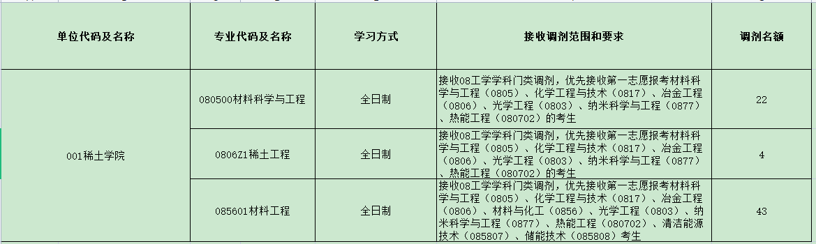 稀土学院将于4月8日00:00开通硕士研究生复试调剂服务系统,系统持续开放12个小时后,学院将根据情况适时关闭。学院部分专业将接收考生调剂,具体如下: